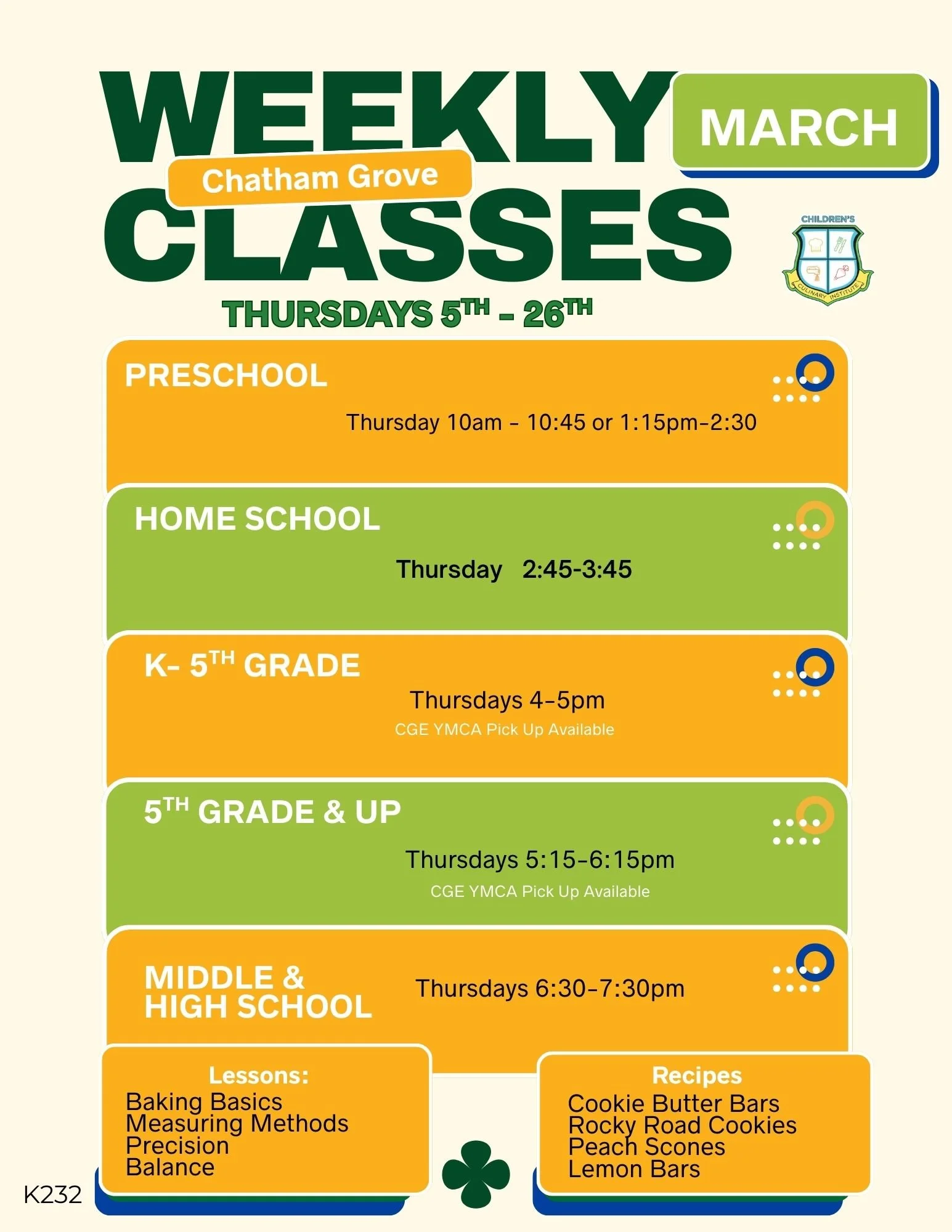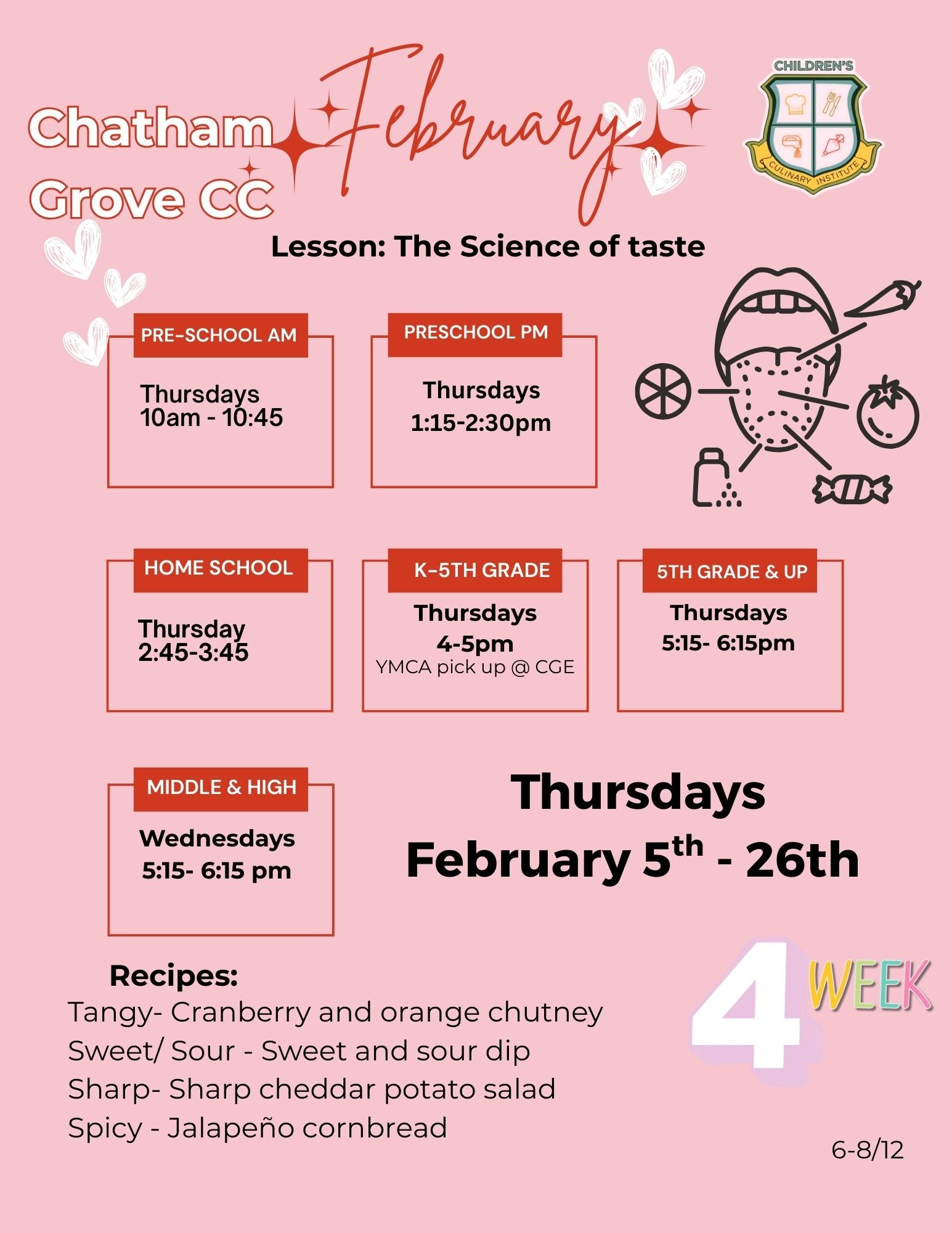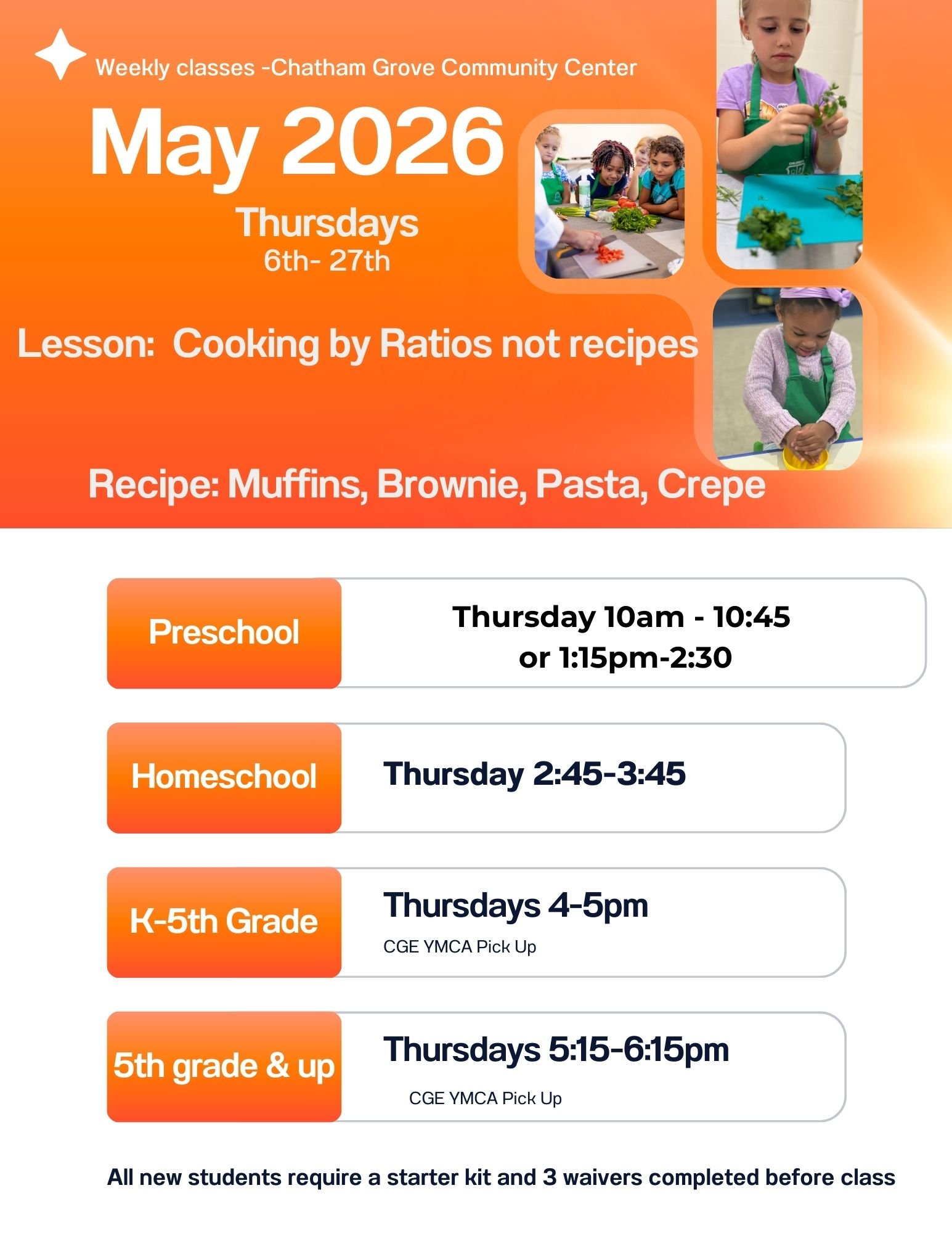 Our Thursday classes at the Chatham Grove Elementary Community Center are a fun and convenient way to experience our weekly class. Our weekly classes are the Chef’s recommendation for proper kitchen learning. If you live close by, or are attending the CGE YMCA after School program, or just like Thursdays best, This is the place for you!